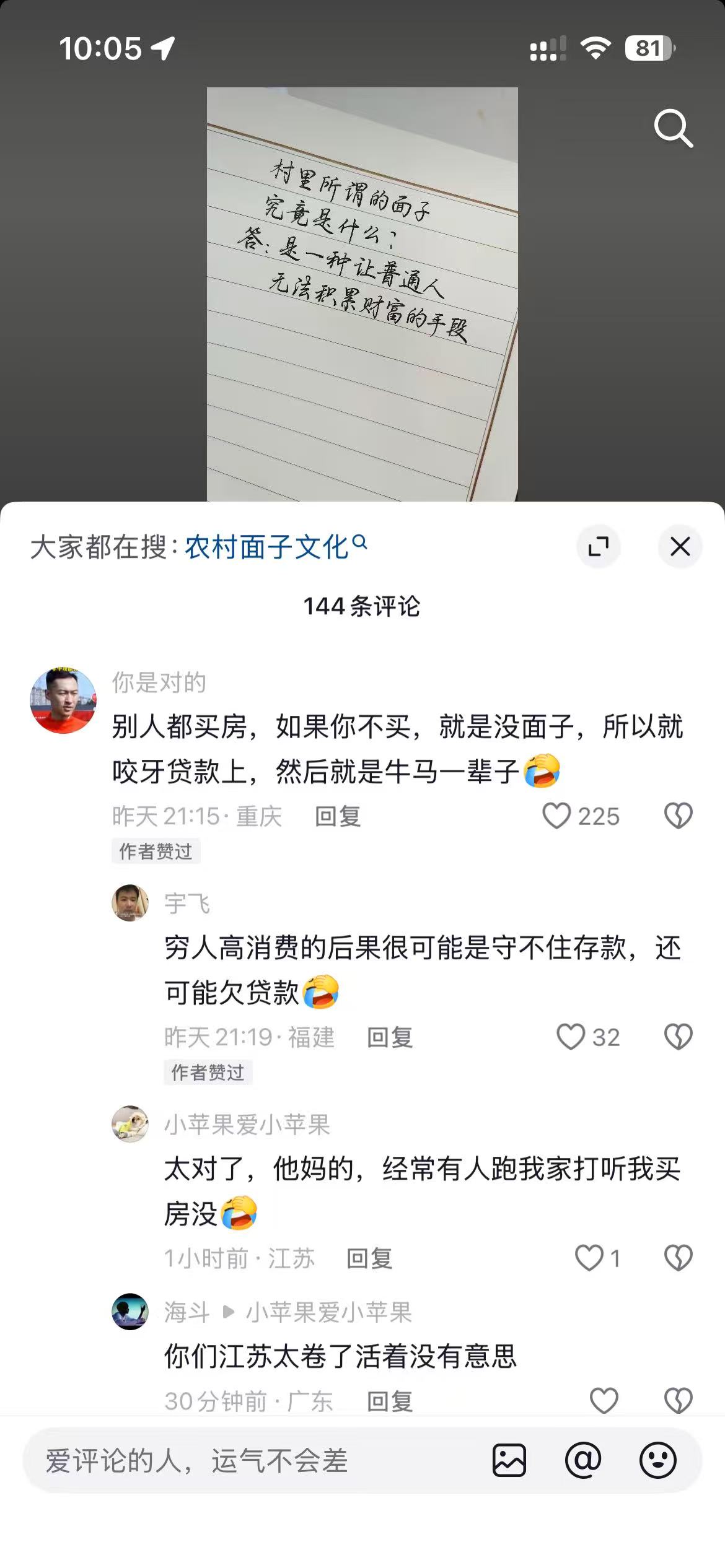 面子不会让你财富增值,年年月月的上班,只是为了一个房子,这样的人生太痛苦了。或许你应该娶一个聪明的女人。当然房子在条件合适的时候,是值得购买的。